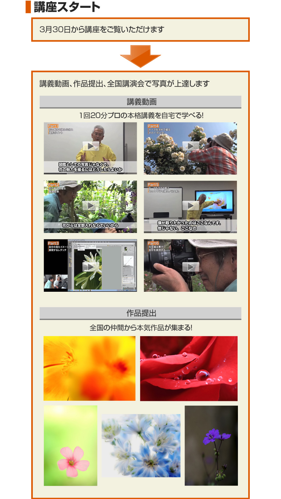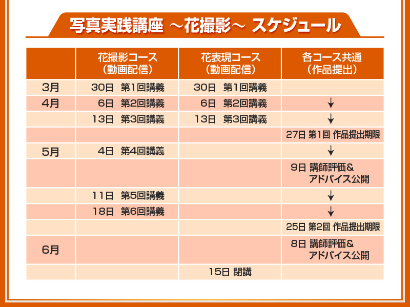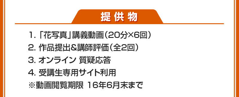 一流プロカメラマンによる、基礎から応用までの花撮影テクニックや花写真のレタッチなどの動画講義を、3ヶ月間に渡って、1回20分程度毎週届けします。