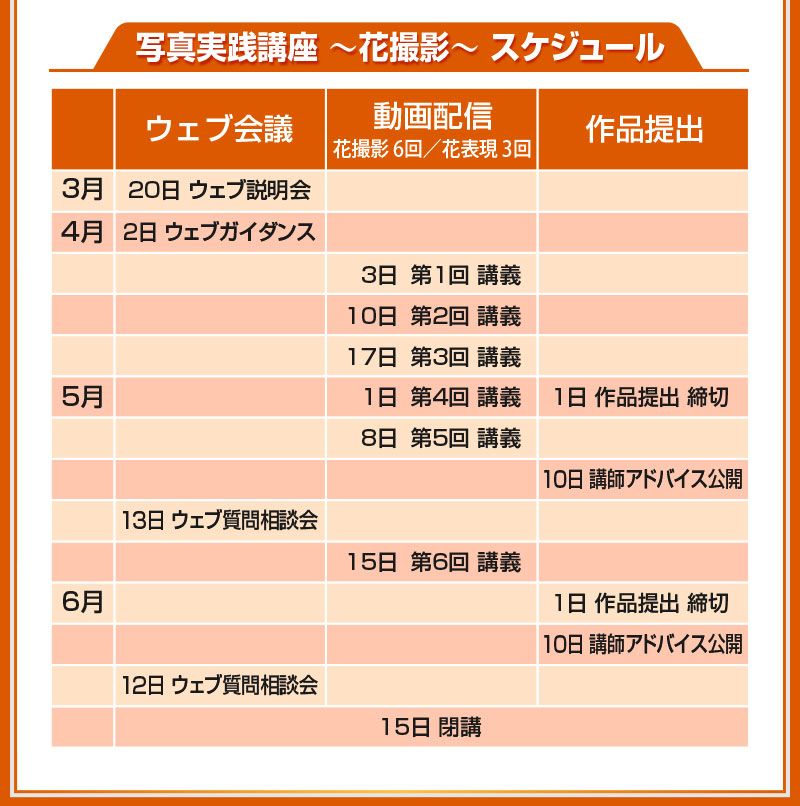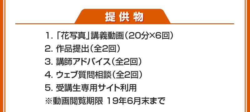 一流プロカメラマンによる、基礎から応用までの花撮影テクニックや花写真のレタッチなどの動画講義を、3ヶ月間に渡って、1回20分程度毎週届けします。